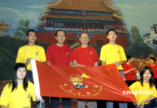 七月二十六日,海外華裔青少年夏令營在北京開營,來自二十九個國家近八百名華裔青少年將在夏令營生活中學習中國民族舞及中華武術(shù)的基本常識。圖為國務(wù)院僑辦副主任劉澤彭、趙陽為夏令營授旗。作者:韓藝冰