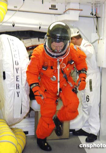 圖:美國(guó)“發(fā)現(xiàn)號(hào)”機(jī)組進(jìn)入太空艙準(zhǔn)備發(fā)射