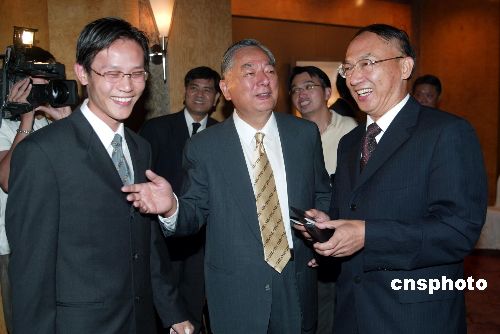 | 七月二十七日,第八屆兩岸奧會體育交流座談會在臺北舉行,中國奧委會主席劉鵬(右)率領(lǐng)雅典奧運(yùn)會冠軍王義夫、陳中等十人,與中華臺北奧委會主席黃大洲(中)、前著名射擊運(yùn)動員杜臺興、跆拳道名將黃志雄(左)等十人,就進(jìn)一步推動兩岸體育交流、北京二零零八年奧運(yùn)會等共同關(guān)心的問題廣泛交換意見。圖為劉鵬受到熱烈的歡迎。作者:盛佳鵬