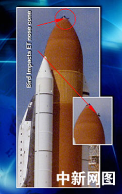 7月26日,美國(guó)“發(fā)現(xiàn)號(hào)”航天飛機(jī)從肯尼迪航天中心發(fā)射升空時(shí),一只鳥在發(fā)射場(chǎng)附近飛過。當(dāng)天下午的新聞發(fā)布會(huì)上,美國(guó)宇航局提供的一幅電視圖片顯示,一只鳥可能在“發(fā)現(xiàn)號(hào)”航天飛機(jī)發(fā)射的時(shí)候撞擊了燃料箱的最前端部分。與此同時(shí),美國(guó)宇航局證實(shí),在26日的發(fā)射升空過程中,“發(fā)現(xiàn)號(hào)”上脫落下來一小塊隔熱瓦和一大塊碎片!鞍l(fā)現(xiàn)號(hào)”底部擋熱板可能有兩處遭到了破壞。