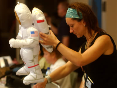 一位美國女記者期待發(fā)現(xiàn)號首次太空行走成功,特意舉起一個準(zhǔn)備太空行走的宇航員卡通人,放在電腦前。