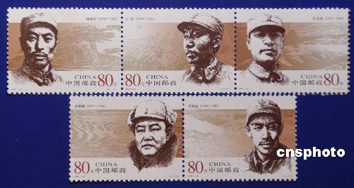 中國(guó)國(guó)家郵政局定于八月一日發(fā)行《人民軍隊(duì)早期將領(lǐng)》紀(jì)念郵票(一套五枚),特五枚郵票名稱(chēng)分別為:楊靖宇(上排左一)、左權(quán)(上排左二)、彭雪楓(上排左三)、羅炳輝(下排左一)、關(guān)向應(yīng)(下排左二),面值均為八十分。作者:鄒憲