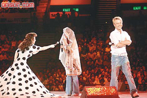 其后,小鳳姐工作人員把頭紗放在盧淑儀頭上,“命令”克勤站在女友身旁,然后把麥克風(fēng)放在克勤嘴邊說(shuō):“你愿意嘛?”又以同一番話詢問(wèn)盧淑儀:“你又愿意嘛?”全場(chǎng)觀眾無(wú)不拍爛手掌和叫囂,雖然小鳳姐一番好意,但克勤卻顯得尷尬萬(wàn)分,對(duì)她說(shuō):“我一路自居不結(jié)婚的,這是在樂(lè)壇屹立多年的秘訣!