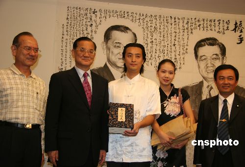 八月四日,中國(guó)國(guó)民黨主席連戰(zhàn)在臺(tái)北接受大陸畫家籍忠亮贈(zèng)送現(xiàn)代水墨畫力作《歷史的握手》。該畫形象再現(xiàn)了四月二十九日連戰(zhàn)與中共中央總書記胡錦濤的歷史性握手。圖為連戰(zhàn)(左二)、國(guó)民黨秘書長(zhǎng)林豐正(左一)在懸掛的畫作前,與籍忠亮(左三)等人合影留念。作者:董會(huì)峰