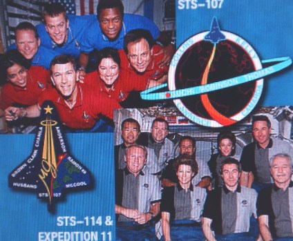 發(fā)現(xiàn)號機長科林斯和任務(wù)專家羅賓遜以及查理.卡馬達,今天換上紅色T恤衫參加太空媒體訪談,之后她又和日本宇航員野口聰一與日本首相小泉等官員進行太空談話。