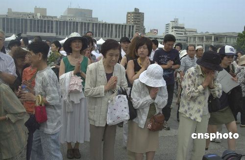 廣島市每年都要在和平公園舉行儀式。今年的紀(jì)念儀式從6日當(dāng)?shù)貢r(shí)間早上8點(diǎn)15分準(zhǔn)時(shí)開(kāi)始,這正好是60年前美軍飛機(jī)投下原子彈的那一刻。