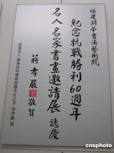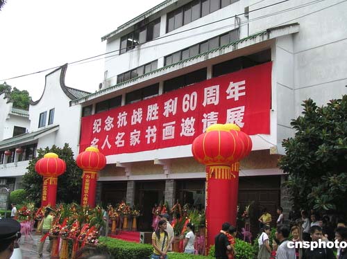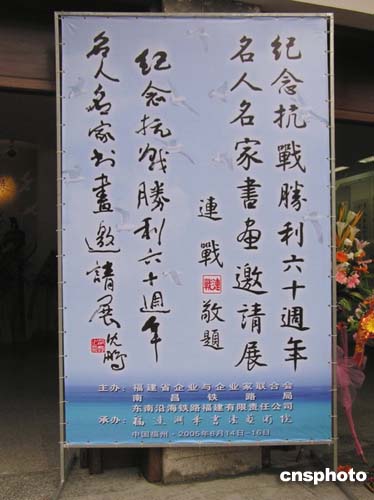 中新網(wǎng)8月14日電 為紀(jì)念抗戰(zhàn)勝利60周年,弘揚(yáng)中華兒女愛國(guó)主義和革命英雄主義精神,推動(dòng)祖國(guó)和平統(tǒng)一大業(yè),由中國(guó)新聞社福建分社、中國(guó)華藝廣播公司和福建淵華書法藝術(shù)院等單位發(fā)起,福建省企業(yè)與企業(yè)家聯(lián)合會(huì)、南昌鐵路局、東南沿海鐵路福建有限責(zé)任公司聯(lián)合主辦的《紀(jì)念抗戰(zhàn)勝利60周年名人名家書畫邀請(qǐng)展》今天上午在福州畫院隆重開展。