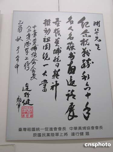 該展覽由中國(guó)國(guó)民黨連戰(zhàn)主席,書畫名家中國(guó)書法家協(xié)會(huì)沈鵬主席分別題寫展標(biāo),兩岸名人名家共同參與。在列展的180多件作品中,既有兩岸抗戰(zhàn)將軍凜凜正氣的題詞,又有涵蓋國(guó)際友人以及國(guó)內(nèi)17個(gè)省市書畫名家精心創(chuàng)作的以抗戰(zhàn)題材為主的書畫作品。本次展覽開展儀式結(jié)束后,現(xiàn)場(chǎng)還舉行了“兩岸攜手,共建和諧;勿忘國(guó)恥,振興中華”的萬人簽名活動(dòng)。