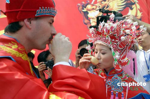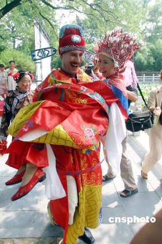 | 8月14日,濟(jì)南市大明湖景區(qū),來自荷蘭的楊文軒(Jan)先生與濟(jì)南姑娘黨妍舉行了一場傳統(tǒng)的中國式婚禮,婚禮上倆人按照中國的傳統(tǒng)習(xí)俗舉行了坐花轎、掀蓋頭、夫妻對(duì)拜等儀式。新娘黨妍今年28歲,2003年9月遠(yuǎn)赴荷蘭愛因霍芬科技大學(xué)學(xué)習(xí)計(jì)算機(jī)專業(yè),同年認(rèn)識(shí)了荷蘭小伙楊文軒(Jan),從此就開始了這段跨國姻緣。作者:龔輝