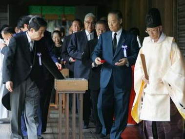 “國會議員參拜靖國神社會”成立于1981年。當?shù)貢r間今天上午11點,以會長自民黨的前建設大臣瓦力以及自民黨前干事長古賀為首,自民黨和民主黨的國會議員一行共47人參拜了靖國神社。