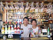 赫爾辛基“楊氏”中餐店老板楊先生與太太在自己開的吧臺(tái)前距奧林匹克體育場(chǎng)很近的地方有一家叫“楊氏”的酒吧兼中餐館。東主楊先生來自中國(guó)廣州市,他在這里已有15年多了。這家中餐館除了有30幾個(gè)座位外,還有一個(gè)吧臺(tái)。