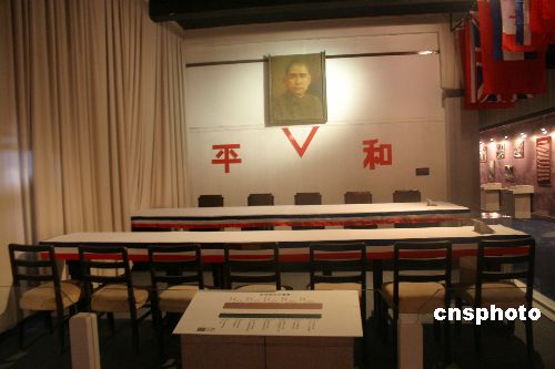 以六十年前日軍中國戰(zhàn)區(qū)投降儀式的真實(shí)文物組成的歷史場景,8月15日在南京博物院正式展出。這次展出的中國戰(zhàn)區(qū)日軍投降簽字儀式的文物有:兩張長條桌、背景墻上掛著孫中山像、會(huì)場的掛鐘、當(dāng)時(shí)中國代表何應(yīng)欽和日本代表岡村寧次使用的毛筆和硯臺(tái)等文具等均為真實(shí)文物。作者:陳光明