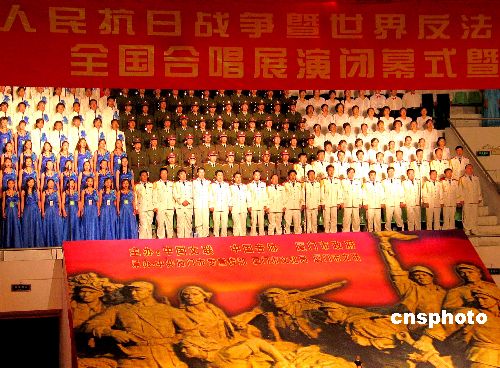 | 8月15日晚,在廈門大學明培體育館舉行“紀念抗日戰(zhàn)爭暨世界反法西斯戰(zhàn)爭勝利60周年全國合唱展演”閉幕式上,全體人員演唱國歌!凹o念中國人民抗日戰(zhàn)爭暨世界反法西斯戰(zhàn)爭勝利60周年全國合唱展演”于8月12日開幕,全國各地57支合唱團共約3400人參加13日舉行的半決賽,其中30支合唱團脫穎而出,參加了14日的決賽。據了解,由廈門市人民政府和國際文化交流基金會共同主辦的第四屆世界合唱比賽定于2006年7月15日至25日在廈門市舉辦。屆時,將有來自世界五大洲60個以上國家和地區(qū)的350多個合唱團,25000多名選手蒞廈參加比賽。作者:藍添藝