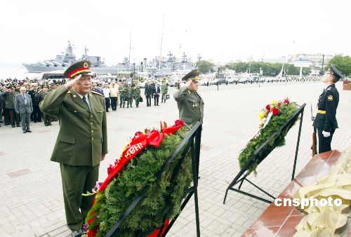 八月十八日,中國(guó)解放軍和俄羅斯軍隊(duì)的總參謀長(zhǎng)梁光烈(左)與巴魯耶夫斯基一起向俄羅斯“太平洋艦隊(duì)?wèi)?zhàn)斗榮譽(yù)”紀(jì)念碑敬獻(xiàn)花圈,向在衛(wèi)國(guó)戰(zhàn)爭(zhēng)中英勇犧牲的俄羅斯軍人致以崇高的敬意。作者:王麗南