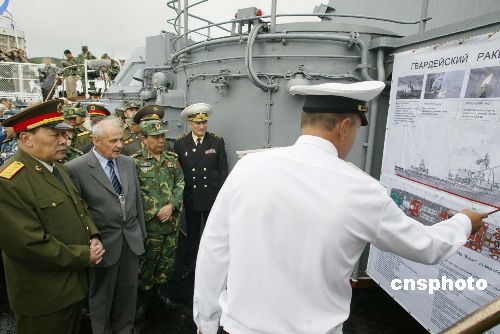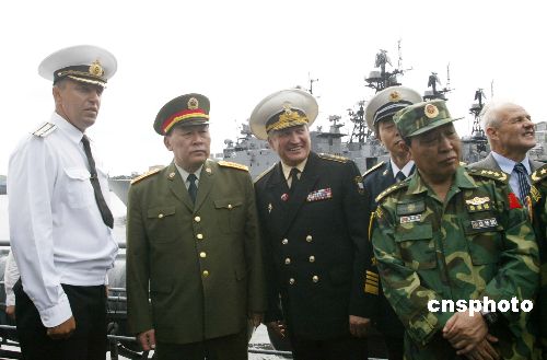 十八日傍晚,中國解放軍總參謀長梁光烈上將(左二),在俄羅斯太平洋艦隊(duì)基地參觀“瓦里亞克”巡洋艦時(shí),聽取俄羅斯軍官介紹情況,太平洋艦隊(duì)司令費(fèi)奧多羅夫海軍上將(左三)、中俄聯(lián)合軍事演習(xí)中方總指揮葛振峰上將陪同參觀。作者:王麗南