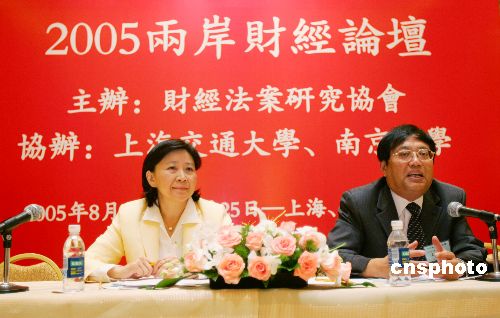 八月二十二日,“二○○五兩岸財(cái)經(jīng)論壇”在上海舉行,多名中國國民黨籍、親民黨籍“立委”以及三十多名臺(tái)灣金融界知名人士出席了本次論壇。圖為親民黨籍“立委”劉憶如(圖左)與上海交大安泰管理學(xué)院院長(右)王方華在本次論壇上。作者:湯彥俊