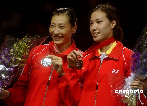 羽毛球世錦賽女單決賽二十一日在美國阿納海姆舉行,世界排名第二的中國選手謝杏芳(右)挑戰(zhàn)衛(wèi)冕冠軍的頭號種子選手張寧(左)獲得成功,摘到女單桂冠。作者:賈國榮