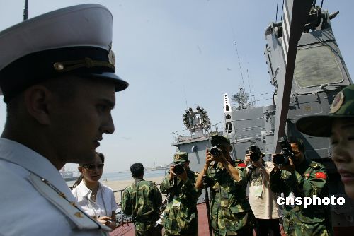 | 八月二十二日,中國部分媒體被中俄軍事演習(xí)俄軍方邀請,參觀采訪此次參加演習(xí)的俄羅斯反潛艦,這艘停靠在青島港的艦艇正整裝待發(fā),明日將起航參加海上封鎖演習(xí)。圖為中國軍方記者對一位在艦上值勤的俄海軍軍官產(chǎn)生濃厚興趣。作者:王麗南