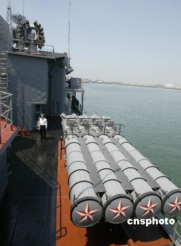 八月二十二日,中國(guó)部分媒體被俄軍方邀請(qǐng),參觀采訪此次參加演習(xí)的俄羅斯反潛艦,這艘停靠在青島港的艦艇正整裝待發(fā),明日將起航參加海上封鎖演習(xí)。圖為反潛艦的一角。作者:王麗南