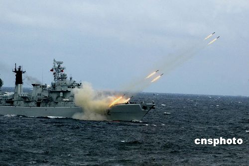 八月二十三日,“和平使命-2005”中俄聯(lián)合軍事演習(xí)第三階段——實(shí)施交戰(zhàn)的海上封鎖演練在中國山東半島及其附近海域開始。圖為中國驅(qū)逐艦發(fā)現(xiàn)目標(biāo)后發(fā)射火箭彈。作者:王麗南