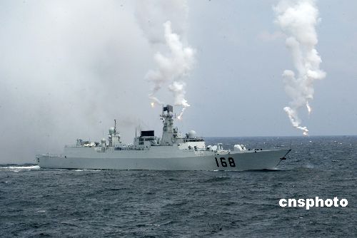 “和平使命-2005”中俄聯(lián)合軍事演習(xí)第三階段8月23日在中國山東半島及其附近海域舉行。圖為中國海軍驅(qū)逐艦釋放電磁干擾彈,抗擊來襲導(dǎo)彈。作者:王麗南