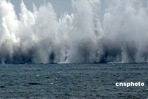 “和平使命-2005”中俄聯(lián)合軍事演習(xí)第三階段8月23日在中國(guó)山東半島及其附近海域舉行。圖為驅(qū)逐艦發(fā)射火箭彈擊中目標(biāo)后濺起沖天水柱。作者:王麗南