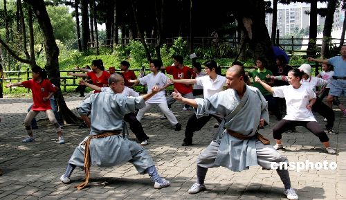 八月二十四日,河南嵩山少林寺武僧團(tuán)在臺(tái)灣開(kāi)展武術(shù)交流活動(dòng)時(shí)與臺(tái)北武術(shù)愛(ài)好者同場(chǎng)習(xí)武。圖為十歲的孫家閎(右)和少林寺延路法師(左)一起演習(xí)少林通臂拳。作者:趙海燕