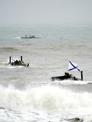 十一時(shí)三十八分,在十二架武裝直升機(jī)掩護(hù)下,俄方一個(gè)海軍陸戰(zhàn)連、十輛裝甲輸送車和中方一個(gè)兩棲裝甲營、三十三輛裝甲戰(zhàn)車搶灘登陸。十一時(shí)四十分,第一波登陸兵順利搶灘上陸,奪占“敵”灘頭陣地。十一時(shí)五十二分,聯(lián)合部隊(duì)三艘登陸艦抵灘,搭載裝甲步兵營的三十二輛步戰(zhàn)車涉水上陸,作為二梯隊(duì)遂行奪占鞏固登陸場行動。