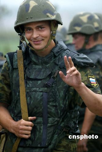 八月二十四日,“和平使命—2005”中俄聯(lián)合軍事演習(xí)兩棲登陸作戰(zhàn)實兵演練在山東半島如期進(jìn)行。圖為完成登陸任務(wù)后的俄羅斯陸戰(zhàn)隊員,盡管全身濕透,仍中國記者微笑致意。作者:王麗南