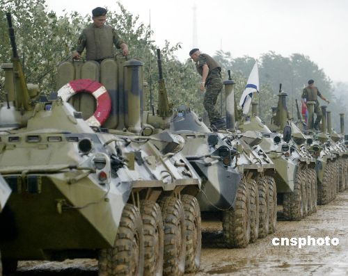 八月二十四日,“和平使命—2005”中俄聯(lián)合軍事演習(xí)兩棲登陸作戰(zhàn)實(shí)兵演練在山東半島如期進(jìn)行。圖為完成登陸任務(wù)后的俄羅斯陸戰(zhàn)隊(duì)員,盡管全身濕透,仍很仔細(xì)地檢查車(chē)輛性能情況。作者:王麗南