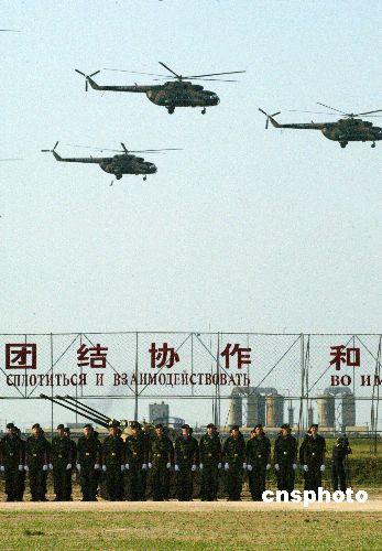 “和平使命-2005”中俄聯(lián)合軍事演習8月25日下午在山東濰北地區(qū)結(jié)束。在當日舉行的閱兵式上,中方直升機編隊在演習結(jié)束后接受檢閱。作者:王麗南