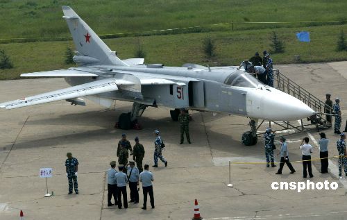 中新網(wǎng)8月26日電 26日上午,參加“和平使命-2005”中俄聯(lián)合軍事演習(xí)的俄羅斯空軍裝備在青島流亭機場進行展示。中共中央政治局委員、中央軍委副主席、國務(wù)委員兼國防部長曹剛川觀看展覽。