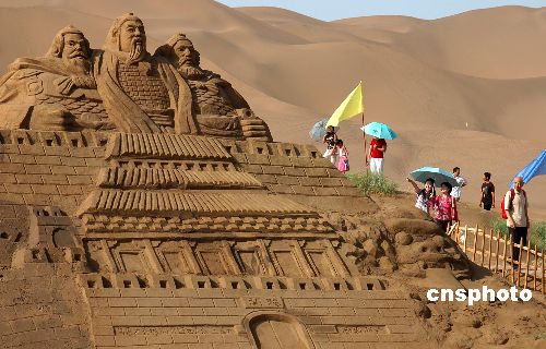 8月27日,幾名游客在欣賞沙雕作品。第二屆中國沙雕藝術節(jié)在新疆鄯善縣庫木塔格沙漠沙雕城開幕,共有12組反映新疆歷史文化、民風民俗的沙雕作品向游人開放。作者:劉健