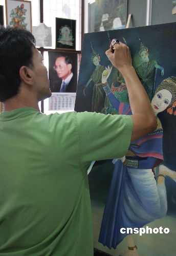 泰國(guó)巴蜀府華欣縣的汪蓋崗翁衛(wèi)星遠(yuǎn)程教育電視臺(tái)開播有一個(gè)職業(yè)教育頻道,以先進(jìn)的衛(wèi)星通訊技術(shù),使職業(yè)技能學(xué)習(xí)更為廣泛地深入全社會(huì)。這個(gè)頻道已開設(shè)繪畫、烹飪、縫紉、電子、計(jì)算機(jī)等各種實(shí)用課程,備受歡迎。圖為汪蓋崗翁衛(wèi)星遠(yuǎn)程教育電視臺(tái)繪畫班的一名學(xué)員,正在繪畫泰國(guó)古裝美女起舞圖,墻上則掛著這家教育臺(tái)的發(fā)起創(chuàng)辦者普密蓬國(guó)王的畫像掛歷。作者:羅欽文