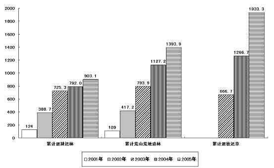 圖表六 “十五”期間退耕還林、荒山荒地造林和退牧還草情況 (單位:萬(wàn)公頃)
