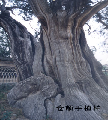 “倉頡手植柏”是廟內最古老的柏樹。此柏腰圍7.28米,根圍9.3米,高17米,林業(yè)專家斷定它足有五千年樹齡。它完全可以同“黃帝手植柏”相媲美。相傳當年倉頡選中這個墓穴后,便在此處栽植了這棵柏樹,所以叫“倉頡手植柏”。