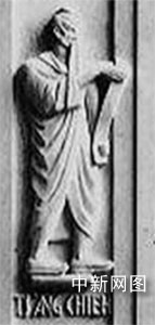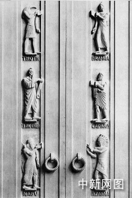 倉(cāng)頡(TS'ANG CHIE)的雕像是在東側(cè)大銅門(mén)上(左扇門(mén)第二個(gè))。國(guó)會(huì)圖書(shū)館對(duì)倉(cāng)頡的概括是“中國(guó)文學(xué)的庇護(hù)神”(the Chinese patron of writing)。顯然,這種評(píng)價(jià)比我們傳統(tǒng)上所認(rèn)為的倉(cāng)頡是造字圣人更高了一步。與倉(cāng)頡雕像放在一起的還有透特(埃及神話(huà)中的月神)、納布(美索不達(dá)米亞阿卡德人的神)、梵天(印度教三大神之一創(chuàng)造之神)、 腓尼基王子卡德摩斯(希臘神話(huà)中能夠“播種龍牙”的神) 以及古代波斯人的英雄塔赫穆拉斯。