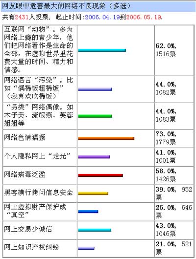 中新網(wǎng)5月9日電 在互聯(lián)網(wǎng)快速發(fā)展的同時,個別網(wǎng)站也存在著傳播不健康信息、刊載格調(diào)低下的圖片、提供不文明聲訊服務(wù),甚至傳播“黃色”內(nèi)容等嚴(yán)重危害社會的問題。就“互聯(lián)網(wǎng)現(xiàn)存的最顯著不良現(xiàn)象”這一話題,新華網(wǎng)最近發(fā)起大規(guī)模網(wǎng)上調(diào)查活動。