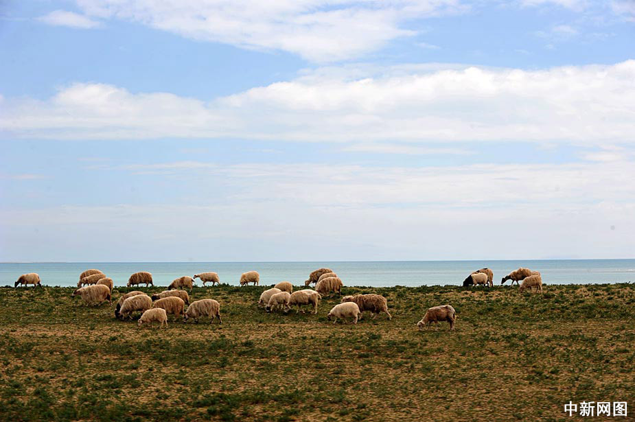 圖為青海湖附近草甸上的羊群。