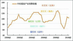 預(yù)警:2010年二季度,中經(jīng)煤炭產(chǎn)業(yè)預(yù)警指數(shù)為103.3點(diǎn),比上季度下降3.4點(diǎn),在“綠燈區(qū)”內(nèi)小幅回落。這主要因?yàn)楫a(chǎn)品銷售收入同比增速出現(xiàn)逆轉(zhuǎn),產(chǎn)量有所下降等。