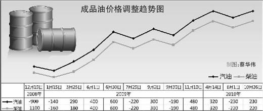 自2008年12月19日至2010年10月26日的成品油價(jià)格變化。負(fù)值為下調(diào)價(jià)格,正值為上調(diào)價(jià)格。