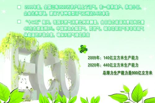 據(jù)悉,在進(jìn)入21世紀(jì)的10年間,我國(guó)政府對(duì)生物天然氣的投入高達(dá)240億元人民幣。2009年年底,全國(guó)已有3507萬(wàn)農(nóng)戶(hù)用上了沼氣,在一些養(yǎng)殖戶(hù)、養(yǎng)殖小區(qū)、企業(yè)化養(yǎng)殖場(chǎng),建設(shè)了各種類(lèi)型沼氣工程達(dá)5.6萬(wàn)多處,形成了每年140億立方米生產(chǎn)能力。中國(guó)已成為世界上沼氣發(fā)展速度最快、建設(shè)規(guī)模最大和涉及人群最多的國(guó)家。