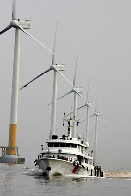 2月22日,上海海事局洋山海事處的巡邏艇正在安裝了風(fēng)力發(fā)電機(jī)的海域巡視。上海東海大橋100兆瓦海上風(fēng)力發(fā)電示范工程,是我國第一個由國家發(fā)改委正式核準(zhǔn)并列為示范項(xiàng)目的大型海上風(fēng)電項(xiàng)目,也是亞洲首座海上風(fēng)力發(fā)電場,目前海上34臺風(fēng)機(jī)安裝已進(jìn)入尾聲,預(yù)計(jì)于今年5月1日前并網(wǎng)發(fā)電。
