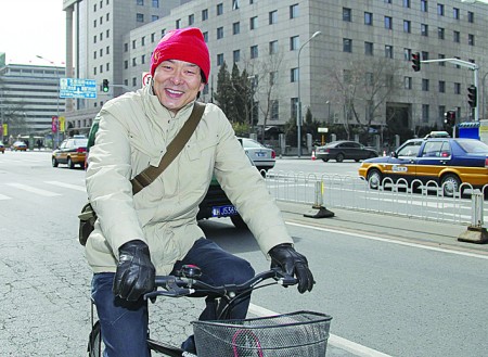 看記者正在拍照,讓他配合一下,他咧嘴笑了,然后騎上車離開了。離開前,記者說,您出行很環(huán)保啊!他開玩笑說,就算低碳一次吧。(記者 郭靜)