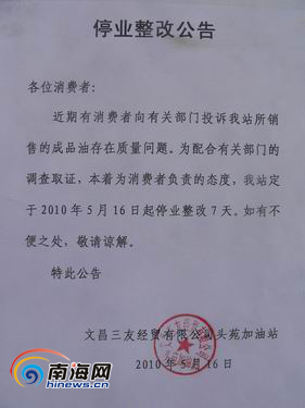 史老板說,5月18日下午他接到相關部門出具的檢測結果,對此結果他沒有異議.在19日中午文昌工商局對他的加油站進行整改,目前處于停業(yè)整改期。