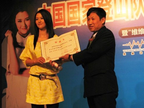 中新社北京三月三十一日電(記者 張希敏)今天,青年歌手譚維維從中國國家體育總局登山運動管理中心領導手中接過授予函,至此,她已成為中國登山隊音樂形象大使,并作為北京奧運會珠峰圣火放歌第一人。