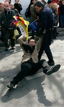 巴黎警方表示,北京奧運火炬從艾菲爾鐵塔出來沿著塞納河傳遞了大約兩百米時受到現(xiàn)場破壞分子的阻撓,火炬兩次被送上安全大巴。