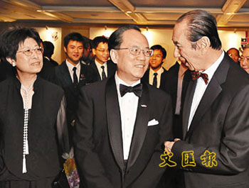 何鴻燊盼做奧運(yùn)火炬手。圖為他15日出席華仁舊生會(huì)晚宴時(shí),與香港特首曾蔭權(quán)及夫人談笑甚歡。(圖片來(lái)源:文匯報(bào))