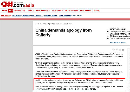 在CNN網(wǎng)站首頁(yè)中部的“Popular News”欄目中,刊登了《China demands apology from Cafferty(中國(guó)要求卡弗蒂道歉)》一文。文章前三段陳述了中國(guó)外交部對(duì)卡弗蒂言論的指責(zé)及要求卡弗蒂道歉的情況,在第四段中這樣說:CNN發(fā)表了一份聲明稱:“不論是卡弗蒂先生本人,還是CNN,都無(wú)意冒犯中國(guó)民眾;在這里,我們?cè)赶蚴艿酱搜哉撚绊懙娜藗兊狼!?/p>