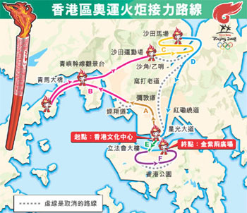 午膳后,火炬由車輛送抵紅磡繞道,跑往尖沙咀海濱和星光大道,在碼頭乘船往中環(huán),取消途經(jīng)九龍華仁書院至彌敦道一段。
